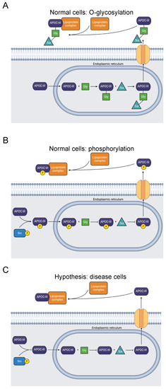 Diagram showing O-glycosylation, sialylation, phosphorylation, and extracellular transport of APOC-III. (A) APOC-III is O-glycosylated and sialylated in the endoplasmic reticulum [76,77]. After extracellular transport, it becomes a constituent of lipoproteins, regulating lipid transport and metabolism [71]. (B) Alternatively, T74 is phosphorylated, precluding O-glycosylation [31]. (C) The mutation T74A abolishes the O-glycosylation and phosphorylation site [23,24,74,75]. Inhibited O-glycosylation and phosphorylation of APOC-III may be related to dysfunctional lipid metabolism, though secretion is not prevented [78].