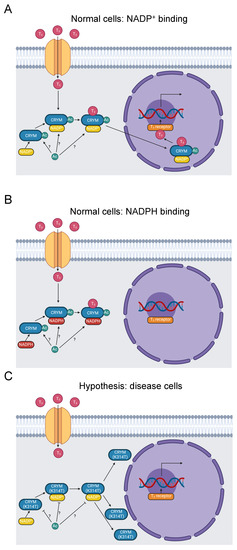 Nonsyndromic sensorineural deafness (NSD) is deafness resulting from dysfunction of the inner ear that is not symptomatic of an underlying syndrome. There are several genes associated with NSD, with one being µ-Crystallin. A screen of 192 Japanese families with NSD discovered causative mutations in µ-Crystallin [90]. Moreover, a Chinese family with NSD inherited an N-terminal P51L mutation, further supporting a role for µ-Crystallin in NSD pathology [91]. Thyroid hormone binds µ-Crystallin, stimulating nuclear translocation and activation of a thyroid-hormone signaling pathway. When µ-Crystallin binds NADP+ and then to T3, it is translocated to the nucleus (Figure 4A). Alternatively, when µ-Crystallin binds the reduced form of NADP+, NADPH, translocation of the complex with T3 is inhibited (Figure 4B) [92].