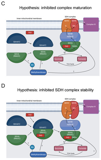 Diagram showing formation of the SDHA-SDHAF2 complex, SDHA methylation, and SDH’s role in oxidative phosphorylation and the TCA cycle. (A) SDHA and SDHAF2 form an intermediate complex, which promotes binding of the FAD cofactor to SDHA [136,137]. The full SDH complex then assembles. The heterotetramer operates as complex II in the electron transport chain and oxidizes succinate to fumarate in the TCA cycle [138]. At some point, R662 of SDHA is methylated [31]. This could occur prior to the SDHA-SDHAF2 complex formation, during SDHA-SDHAF2 complex formation, during SDH complex assembly, or after SDH complex assembly, as indicated by the “?” symbol. (B) R662C disrupts R662 methylation and precipitates MCIID [23,24,139]. A possible mechanism is disruption of SDHA flavinylation. (C) Another possible mechanism is inhibited complex maturation and formation of the SDHA-SDHAF2 complex. (D) A final proposed mechanism is increased instability of the full SDH complex.