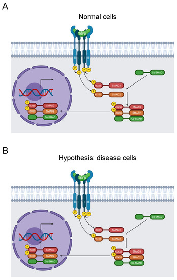 Diagram of the SMAD signaling pathway. (A) TGF-β binds to TβRII and subsequently recruits TβRI. TβRII subsequently activates TβRI by phosphorylation, which transduces the signal by phosphorylating SMAD2 and SMAD3 on their SXSS > motifs. Activated SMAD2 and SMAD3 then form a complex with a co-SMAD before translocating to the nucleus and stimulating gene expression [147]. (B) The S423N mutation disrupts the key SSXS > motif for SMAD3 phosphorylation and activation, thereby inhibiting further signal transduction and regulation of RNA transcription by the SMAD complex [147]. This causes FTAAD [23,24].