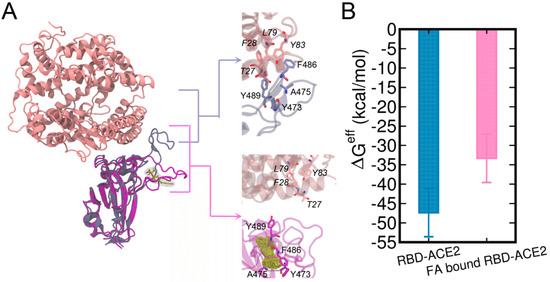 RBD-ACE2 complex and FA-bound RBD-ACE2 complex are aligned by the RBD (A). The structures of ACE2 and RBD are shown in pink and ice blue cartoons while the FA-bound RBD is shown in purple, respectively. FA molecule is shown in the yellow meshed surface. The effective binding free energies (ΔGeff) [66] calculated using the MM/GBSA method are also shown (B).