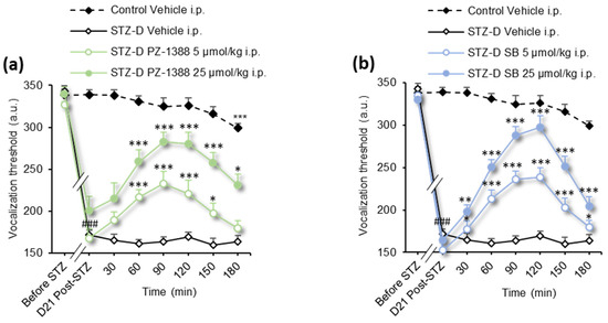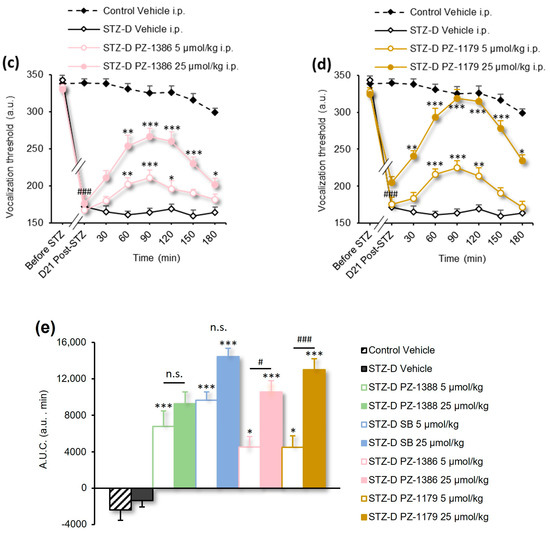 To explore the role of constitutive activity of 5-HT6 receptor in the development of pDN, two well-characterized inverse agonists, PZ-1388 and SB258585, were injected intraperitoneally (i.p.), and mechanical thresholds to paw pressure were measured up to 180 min after injection. Pharmacological inhibition of the 5-HT6 receptor constitutive activity by PZ-1388 and SB258585 administered at the doses of 5, and 25 µmol/kg significantly attenuated diabetes-induced mechanical hyperalgesia 60–150 or 180 and 30–180 min after injection for PZ-1388 and SB258585, respectively (Figure 1a,b, Table 1). The time course of the antihyperalgesic effect of the drugs showed a maximal effect at 90 min for PZ-1388 and 120 min for SB258585 and corresponded to a pain improvement of 83 ± 21% and 86 ± 9%, respectively. The overall effect assessed by calculation of the area under the time-course curve (A.U.C. 0–180 min) of vocalization threshold changes of the two compounds showed no significant differences between the 5 and 25 µmol doses for each (Figure 1e, Table 1).