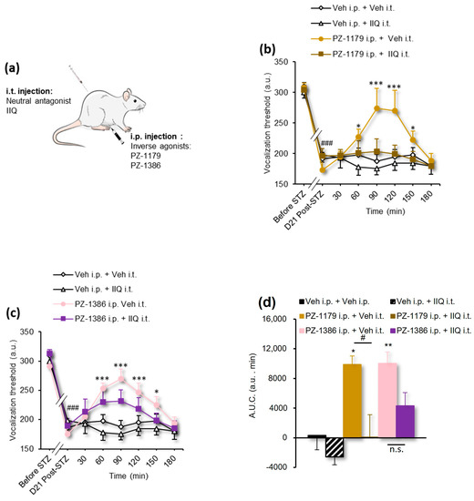 Since the anti-allodynic effect of PZ-1388 and SB258585 has been reported to be dependent on spinal 5-HT6 receptors in SNL and OXA rats [21], we sought their involvement in pDN. To investigate the role of spinal 5-HT6 receptors in diabetes-induced hyperalgesia, the neutral antagonist IIQ (2 nmol/rat) was injected intrathecally (i.t.) just before i.p. administration of PZ-1179 (25 µmol/kg) or PZ-1386 (25 µmol/kg) or vehicle (water for injections) (Figure 2a) and vocalization thresholds to paw pressure were measured up to 180 min. Consistent with previous findings indicating that neuropathic pain results from a constitutive activity of 5-HT6 receptors rather than tonic 5-HT6 receptor activation by endogenous serotonin [21], i.t. administration of the selective neutral antagonist IIQ did not alter the paw pressure-induced vocalization threshold in STZ diabetic rats but completely abolished the antihyperalgesic effect of PZ-1179 (PZ-1179 + IIQ group) (Figure 2b, Table 1). Behavioral results obtained after co-administration of PZ-1386 and IIQ showed an inhibition of the antihyperalgesic effect of PZ-1386 (PZ-1386 + IIQ group) despite a slight elevation of vocalization thresholds to paw pressure (Figure 2c, Table 1). The A.U.C. of the vocalization thresholds changes, which confirms the loss of the antihyperalgesic effect of PZ-1179 and PZ-1386 in the presence of the neutral antagonist (Figure 2d, Table 1). These results indicate that spinal 5-HT6 receptors’ constitutive activity plays a critical role in pDN.