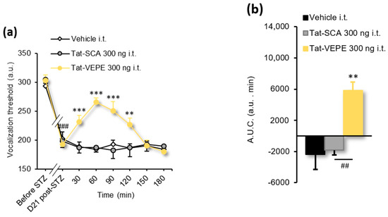 Intrathecal administration of Tat-VEPE attenuates mechanical hyperalgesia (paw pressure test) in STZ diabetic rats. (a) Intrathecal administration of a cell-permeable interfering peptide fused to the transduction domain of the HIV Tat protein (Tat-VEPE, 300 ng/rat) increases the vocalization threshold to paw pressure application in STZ-D rats (n = 6–7 /group). ### p < 0.001 vs. values measured before STZ. ** p < 0.01, *** p < 0.001 vs. values measured before the drug/vehicle injection (D21 Post-STZ), 2-way ANOVA; (b) Area under the curve (A.U.C.) of vocalization threshold variations in STZ rats calculated by the trapezoidal rule (in a.u. min). ** p < 0.01 vs. Vehicle group; ## p < 0.01 vs. corresponding group, 1-way ANOVA.