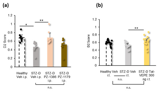 Pro-cognitive effects of 5-HT6 receptor ligands have been reported not only in traumatic neuropathic pain models [21] but also in several paradigms of cognitive impairment [22,23,40,41]. Because diabetic rats, like diabetic humans [9], develop cognitive deficits, we next examined whether inverse agonists and peptidyl mimetic strategy would be effective in ameliorating cognitive deficits associated with chronic pain in hyperalgesic diabetic rats. We, therefore, tested the effect of PZ-1179 and PZ-1386 upon episodic memory (NOR task). STZ diabetic rats treated with vehicle failed to discriminate a novel object from the familiar one (Figure 5a, Table 1). Systemic (i.p.) administration of PZ-1386 (25 µmol/kg) but not PZ-1179 (25 µmol/kg) restored the episodic memory deficit elicited by pDN (Figure 5a, Table 1). Reminiscent of the pro-cognitive effect of PZ-1386, intrathecal injection of Tat-VEPE (300 ng/rat) increased novelty discrimination in STZ diabetic rats (Figure 5b, Table 1).