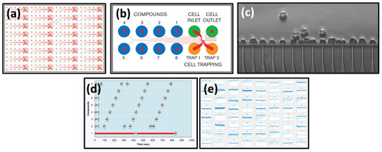 Microfluidic experimental layout. (a) A 384-well HT Mercury plate layout showing 32 repeats of the same perfusion system. The orange color depicts the 12 wells and the microfluidic channels connecting them. (b) Single experimental pattern and microfluidic channels. Compounds are loaded into wells 1–8 (blue), cells are loaded into the inlet and intracellular solutions in the 2 traps well (orange). (c) Fourteen HEK293 cells trapped prior to whole cell seal formation. (d) Eight compounds and nine dose response protocols. (e) Representative data file with 192 dose responses collected in 15 min.