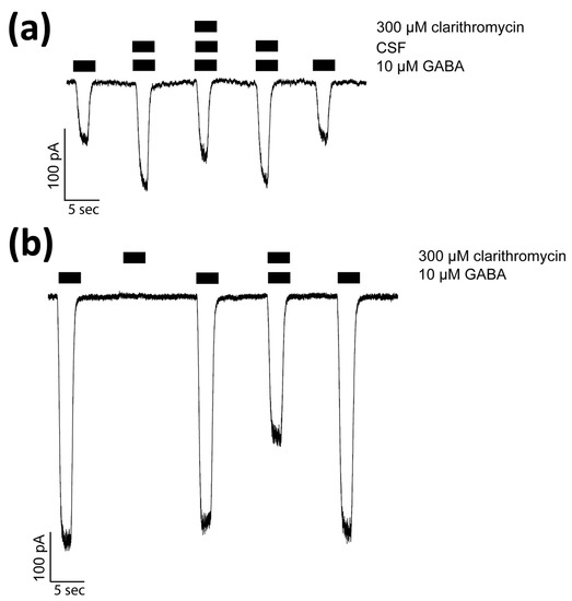 - Bichler, E.K.; Elder, C.C.; García, P.S. Clarithromycin increases neuronal excitability in CA3 pyramidal neurons through a reduction in GABAergic signaling. J. Neurophysiol. 2017, 117, 93–103. [Google Scholar] [CrossRef] [PubMed]
