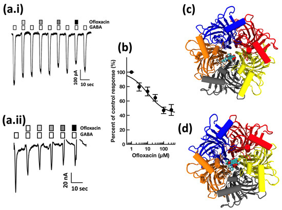 Ofloxacin inhibits GABAA receptor activation in a concentration-dependent manner, and preferentially docks in the channel lumen at a location shared by rifampicin. (a.i) Conventional single electrode whole cell voltage clamp recording from a HEK293 cell expressing human α1β2γ2s GABAARs. Open bars above the current trace indicate the duration of GABA application. Shaded bars indicate the duration of ofloxacin application. Darker shading indicates increased concentration. The concentrations applied were 1, 3, 10, 30 μM ofloxacin. Calibration bars indicate current amplitude and duration in pA and seconds. (a.ii) Representative microfluidic ensemble whole cell recording from HEK293 cells expressing rat α1β2γ2s GABAA receptors. Open bars above the current trace indicate the duration of GABA application. Shaded bars indicate the duration of ofloxacin application. Darker shading indicates increased concentration. The concentrations applied were 3, 10, 30, 100, and 300 μM ofloxacin. Calibration bars indicate current amplitude, and duration in nA and seconds. (b) Ofloxacin concentration response relationship for GABA receptor modulation. Each point is plotted as mean ± standard error of the mean for 20–24 determinations. (c) The ofloxacin binding pocket is predicted to be defined by the lumen-facing residues of the BAE chains (βαβ subunits). (d) The rifampicin binding pocket is predicted to be defined by lumen-facing residues of the BAED chains (βαβγ subunits). Color key: α subunit (red and grey), β subunit (yellow and orange), γ subunit (blue).