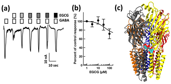 Our data suggest that the chalate EGCG inhibits GABA activation and shares the α+β− GABA-binding pocket. Campbell et al. have also shown that EGCG blocks GABA activation [28]. In their detailed study, they show that the block is underpinned by an increase in the GABA EC50. Taking these observations together, we hypothesize that the α+β− interface contains a functional GABA binding site that can be targeted by the competitive antagonists clarithromycin and EGCG. The GABA antagonist actions of these compounds are consistent with their use in humans, where they are both associated with increased arousal [9,10,29].