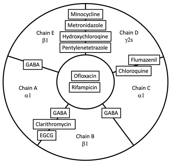 Next, our docking studies predicted that the 8/9 of molecules under investigation could bind one of four distinct binding pockets in the 6DW0.pdb model of the rat α1β1γ2s receptor. The only exception was erythromycin, which failed to interact with the model. We found that none of the compounds located into either of the two canonical GABA β+α− binding sites, or any of the transmembrane anesthetic binding pockets. Our docking studies predicted that chloroquine, like flumazenil, can locate in the α+γ− benzodiazepine binding site (see Figure 6c). Next, we found that ofloxacin and rifampicin can bind to the central axial extracellular lumen between the five subunits (see Figure 5c,d). Clarithromycin preferentially docks to the α+β− cavity that until recently was thought to be an orphan homologue of the two β+α− GABA binding sites (see Figure 3c). However, this view has recently been challenged, and this site has been proposed to be a third GABA binding site [34]. We found that EGCG also docked at this interface, but closer to the transmembrane region where it can interact with residues in the cys-loop and the TM23 linker. Finally, the orphan binding pocket at the γ+β− interface is predicted to interact with MIN, HCQ, MET, and PTZ (see Figure 6d, Figure 7c and Figure 4c). This latter finding is particularly interesting, since despite its long clinical use and known interactions with GABAA receptors, no binding site has been proposed for PTZ. The in silico modeling parameters determined in this study are shown in Table 2, and the different docking site locations are summarized in Figure 9.