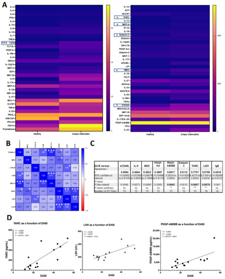Th2-related chemokines are significantly upregulated in atopic dermatitis patient blood and TARC significantly correlates with disease severity. (A) Heatmap of median plasma cytokine and chemokine concentrations (pg/mL) determined using a 71-plex immunoassay; results are visualized according to concentration (0–50 pg/mL, left-panel; 0–5000 pg/mL, right-panel); moderate-to-severe adult AD patients (n = 15), matched healthy subjects (n = 7); statistics calculated using the non-parametric Mann-Whitney test per row, with individual ranks for each comparison followed by Holm-Šídák’s multiple comparisons test, alpha 0.05. Significantly elevated chemokines are indicated with asterisks; unadjusted p < 0.001, p values adjusted for multiple comparisons indicated. Not indicated are sCD40L, FGF-2, IL-13, IP-10, MCP-3, TFNα, VEGF-A, BCA-1 (unadjusted p < 0.05, all) and IL-9, IL-5, (p < 0.01, both) as significance is lost following adjustments for multiple comparisons. (B–D) AD patients (n = 15); (B) correlation between significantly elevated biomarkers, lactate dehydrogenase reported by clinical laboratory (U/L), and AD patient disease severity, measured according to the Eczema Area and Severity Index (EASI), indicating Spearman’s rho. (C) TARC, LDH, and PDGF-AB/BB correlate significantly with disease severity (EASI); analytes with a trend toward correlation are included for comparison (sCD40L, IL-9, MDC, PDGF-AA, Eotaxin-3, IgE). (D) Simple linear regression, modelling TARC chemokine, LDH, and PDGF-AB/BB growth factor concentrations (pg/mL) as a function of EASI. (A–D) * p ≤ 0.05, ** p ≤ 0.01, *** p ≤ 0.001. ns = not significant.