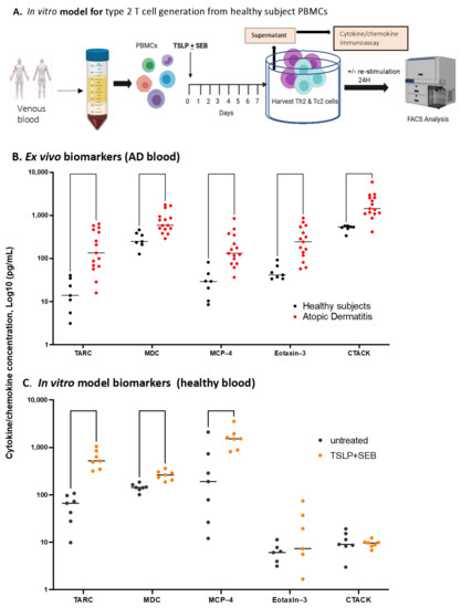 After one week, TSLP/SEB-stimulated blood mononuclear cultures secreted the canonical Th2 cytokines IL-13, IL-5, and IL-9, but very limited IL-4. Interestingly, protein levels of IL-13, but not IL-4, are consistently detected and shown to be increased in AD skin across studies [52,59]. These findings suggest that the combination of skin derived TSLP/SEB is sufficient to generate canonical pathogenic AD cytokines in blood (Figure 3B). Stimulation in vitro significantly elevated IL-13+ Th2 and Tc2 cells and increased master transcription factor GATA3 as well as the key Th2-promoting co-stimulatory receptors ICOS and OX-40, efficiently replicating cellular profiles seen in AD patients. Our findings also add to existing evidence that OX40L on TSLP-activated DCs triggers Th2 deviation in the absence of IL-12 [60]. Interestingly, several monoclonal antibodies blocking the OX40L:OX40 axis have shown efficacy in AD and are currently in advanced human trials [61]. In our model, key AD biomarkers are reproduced, including TARC/CCL17, MDC/CCL22, and MCP-4/CCL-13; of note, biomarkers derived from epithelia or the endothelium (C-TACK/CCL27 and Eotaxin-3/CCL26) were not reproduced in our model due to a lack of endothelium/epithelium.