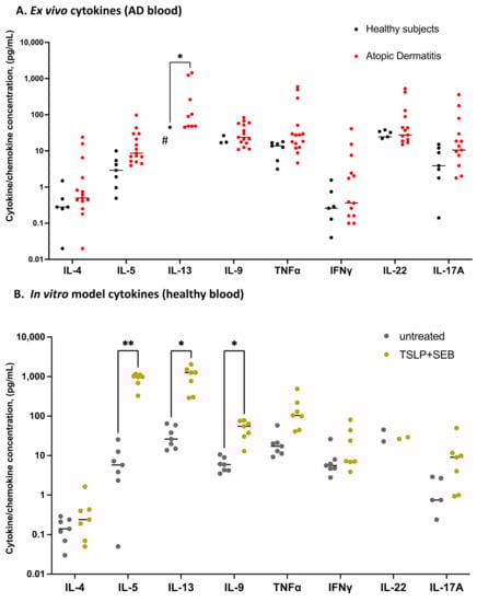 Stimulation with TSLP/SEB in vitro induces AD-like type 2 cytokine secretion from healthy PBMCs. Master cytokines secreted by type 1, 2, 3, or 22 polar T cells, as well as a regulatory (IL-10) cytokine, were tested ex vivo and in vitro. (A) Adult AD patients’ (n = 15) plasma tested ex vivo, relative to healthy subjects (n = 7). Significant IL-13 elevation, unpaired t tests per row, followed by Holm-Šídák’s multiple comparisons test. Significant for IL-5 by Mann-Whitney tests per row, followed by Holm-Šídák’s correction (p < 0.05, data not shown). (B) Stimulation with TSLP/SEB induces type 2 cytokines in vitro. PBMCs from healthy subjects (n = 7) cultured with TSLP/SEB one week, followed by collection of supernatants, with no mitogen re-stimulation; polar cytokine panel as in A. Paired t test per row, followed by Holm-Šídák’s multiple comparisons test. (A,B) * p ≤ 0.05, ** p ≤ 0.01. #, note: log scale; zero values not plotted on log scales.