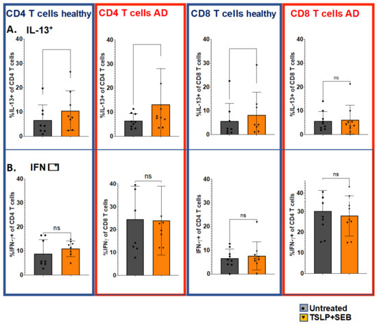 In vitro stimulation with TSLP/SEB enriches IL-13+ CD4 and CD8 T cells from healthy PBMCs. Intracellular cytokine detection by flow cytometry, following culture and re-stimulation (PMA/Ionomycin/GolgiStop, 6h) for intracellular cytokine detection ((A); IL-13, and (B); IFNγ). PBMCs from healthy subjects (n = 8) cultured with TSLP/SEB for one week; proportion (%) of IL-13+ (Th2/Tc2) versus IFNγ+ (Th1/Tc1) CD4/CD8 T cells. Statistical significance was determined by Wilcoxon matched-pairs signed rank test. Experiments performed in duplicates or triplicates, ns = non significant.