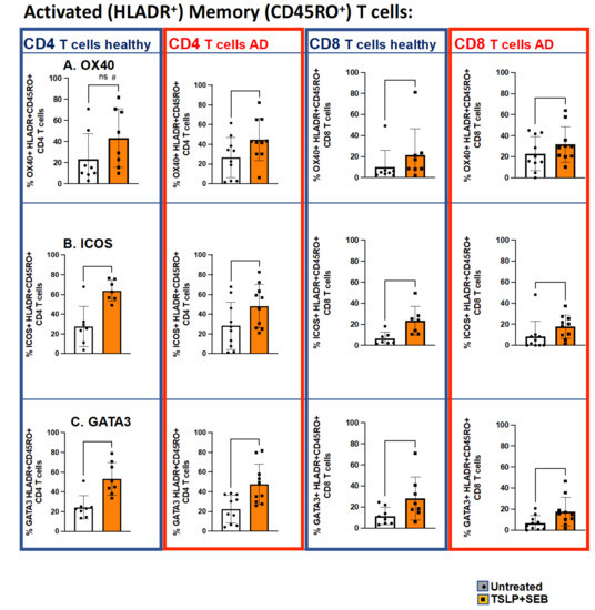 In vitro TSLP/SEB significantly increases GATA3+, OX40+, and ICOS+ activated memory CD4 and CD8 T cells in PBMCs. PBMCs from healthy subjects (n = 8, blue columns) or AD subjects (n = 10, red columns) were cultured with TSLP/SEB for one week, followed by multiparametric staining and flow cytometry, with no mitogen restimulation. Proportion (%) of co-stimulatory receptor (row A, OX40; row B, ICOS) and transcription factor (row C, GATA3)-expressing activated (HLADR+) memory (CD45RO+) CD4 (left-hand panels) and CD8 (right-hand panels) are indicated. Statistical significance was determined by Wilcoxon matched-pairs signed rank test. Experiments performed in duplicates or triplicates, # indicates a trend (p = 0.0781) toward increased % OX40 HLADR+CD45RO+CD4 T cells in treated healthy PBMCs. ns = non significant.