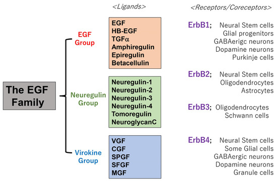 Molecular cloning and protein sequencing allowed us to discover novel homologs or orthologs of EGF, which can evoke the same or similar activities [6,7,8] and include three subfamilies: the EGF group, neuregulin group, and virokine group (Figure 1). Despite the peripheral functions of the EGF family in previous studies, the high expressions of heparin-binding EGF-like growth factor (HB-EGF) and transforming growth factor alpha (TGFα) have been reported in the central nervous system (CNS) [9,10]. High levels of neuregulin-1 mRNA and protein are also detectable in brain neurons [11,12], suggesting the hidden functions of the EGF family in brain development and plasticity [13,14,15].
