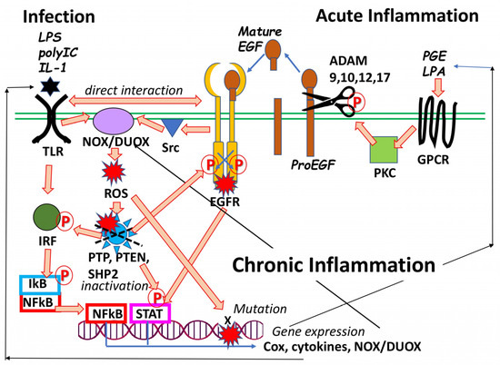 Interaction between Toll-like receptor (TLR) and EGF receptor tyrosine kinase (EGFR/ErbB1) in chronic inflammation and carcinogenesis. Many reports confirm the contribution of EGFR signaling to TLR-mediated chronic inflammation [37,38]. In addition, other studies indicate the requirement of EGFR in the TLR signaling itself [22,23,24]. EGFR signaling induces NADPH oxidase (NOX) activation resulting in the production of reactive oxygen species (ROS) and hydrogen peroxide, which inactivate protein phosphatases (SHP2, PTP1B, PTEN, etc.), elevating basal phosphorylation (P) or enhancing induced phosphorylation (P) of adaptor or signaling molecules: IRF, IkB, STAT, MAP, etc. Alternatively, ROS reacts with DNA, producing DNA mutation and leading to carcinogenesis. Elevation of their phosphorylation results in the DNA binding of NFkB, STAT, and AP-1 [39], leading to cell proliferation and gene expression of NOX, cyclooxygenase (COX), and cytokines and worsening inflammation. These promote the production of prostaglandins (PGE) and lysophosphatidic acid (LPA), which bind to their receptors of G-protein-coupled receptors (GPCRs). Activated protein kinase C (PKC) transactivates metalloproteases in a disintegrin and metalloprotease (ADAM) 9, 10, 12, or 17 [40,41]. ADAM cleaves the membrane-anchored EGF precursor or precursors of other members of the EGF family such as HB-EGF and TGFα and liberates mature EGF or its homolog, activating EGFR. These feed-forward and feed-back interactions between TLR and EGFR are implicated in the pathogenesis of chronic inflammation as well as in carcinogenesis.