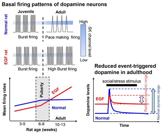 Age-dependent alteration of firing activity of dopamine neurons. Baseline burst firing is reduced in the post-pubertal stage in parallel with the increase in SK channel expression in normal development. In contrast to the profile of normal animals, baseline burst firing is elevated and the expression of SK channels is reduced in the EGF model at their post-pubertal stage [117]. Accordingly, event-triggered and stress-evoked fractions of dopamine (DA) release are relatively suppressed with the given high baseline release and might be implicated in their stress vulnerability.