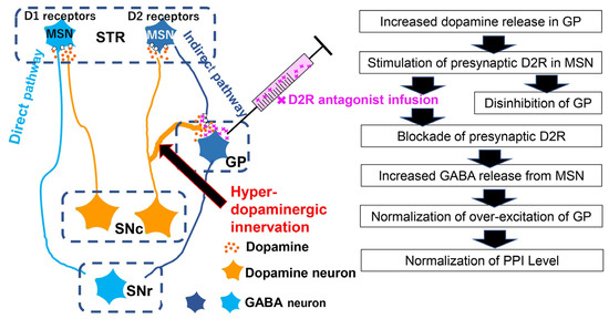 The dopamine releasers of amphetamine and cocaine are known to decrease prepulse inhibition (PPI) of acoustic startle responses [124,125]. PPI reduction is induced by the non-selective dopamine receptor agonist apomorphine as well [126,127]. These reports indicated that hyperdopaminergic states are involved in the PPI reduction. Among the hyperdopaminergic regions in EGF model rats, our pharmacological interventions revealed that the globus pallidus plays a crucial role in PPI reduction [83] (Figure 4). The local infusion of a D2 receptor agonist, but not a D1 receptor agonist, into the globus pallidus of normal rats mimics the effects of EGF, that is, PPI reduction. Conversely, the local infusion of a D2 receptor antagonist, but not a D1 receptor antagonist, into the globus pallidus of EGF model rats ameliorated their PPI deficits [83]. The role of dopamine D2 receptor signaling in PPI regulation is also supported by previous pharmacological studies [128,129,130] and by gene ablation experiments of dopamine receptors [131]. However, in addition to our argument, the A10 dopaminergic pathway for the nucleus accumbens and the A9 pathway for the anteromedial striatum are also implicated in PPI regulation [132,133,134,135,136]. In these respects, controversies remain regarding the main dopamine pathway for PPI regulation and the mutual interactions of individual basal ganglia circuits.
