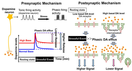 The effect of basal dopamine release on behavioral regulation. Releases of dopamine (DA) are regulated by two independent modes: tonic and phasic activities of dopamine neurons. In the resting state (a baseline condition), tonic activity contributes to maintaining basal dopamine levels in the targets. Stressful events cause a phasic activity to trigger dopamine release and acutely increase dopamine levels. In contrast, a higher basal dopamine level at the resting state decreases the dynamic range of phasic dopamine efflux, attenuating the dopamine-dependent behavioral responses (Presynaptic Mechanism). Alternatively, the increased basal dopamine level causes the internalization of dopamine receptors in the targets and downregulates the receptor signaling. Even if the event-related phasic dopamine efflux occurs, the responses of the postsynaptic dopamine receptors are attenuated (Postsynaptic Mechanism).