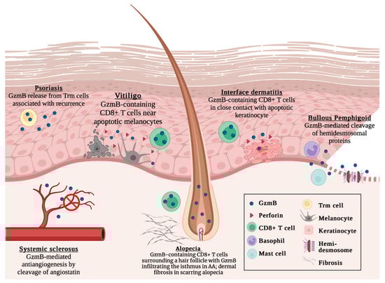 Current understanding of GzmB in cutaneous autoimmune diseases, including psoriasis, vitiligo, systemic sclerosis, alopecia areata, interface dermatitis, and bullous pemphigoid. Not to scale. Created with BioRender.com, accessed on 4 January 2023.