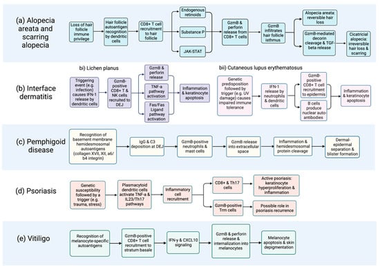 Flow chart depicting proposed GzmB involvement in the immunopathogenesis of cutaneous autoimmune diseases, including (a) alopecia and scarring alopecia; (b) interface dermatitides such as (bi) lichen planus and (bii) cutaneous lupus erythematosus; (c) pemphigoid disease; (d) psoriasis; and (e) vitiligo. Of note, the contribution of extracellular GzmB to disease onset and severity requires further elucidation and is likely underrepresented in this figure. Characterization of the extracellular functions of GzmB is an area of ongoing investigation. Systemic sclerosis is not included due to the absence of relevant data. Created with BioRender.com, accessed on 17 February 2023.