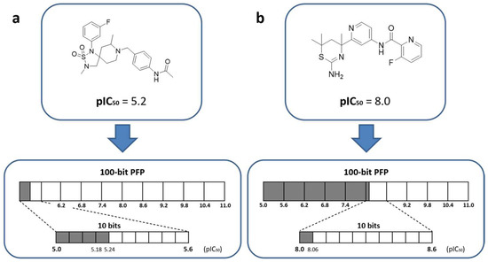 In this work, we introduce a novel concept for compound potency prediction that combines a special fingerprint (FP), termed structure–potency FP (SPFP), with a deep learning approach. FPs accounting for chemical structure and topology are a mainstay for chemical similarity searching [32,33]. SPFP is the first FP representation specifically designed to combine compound structure and potency information in a modular format. Using SPFP, a conditional variational autoencoder (CVAE) [34,35] is trained to predict potency from chemical structure using the structural module of test compounds as input. Given the uniform structure–potency bit string encoding, SPFP–CVAE models do not depend on class labels or associated variables for learning.