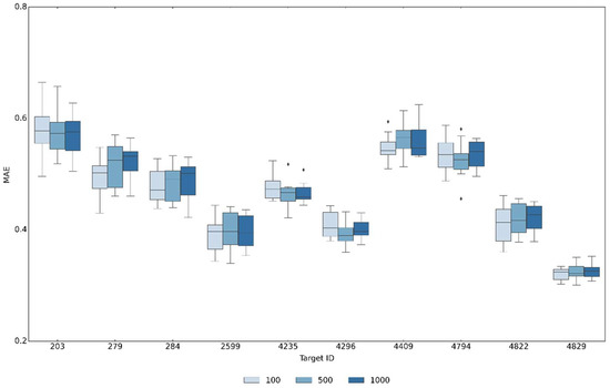 Prediction accuracy for SPSF with differently sized potency modules. Boxplots report mean absolute error (MAE) values of SPFP–CVAE models using alternative SPFP versions with potency modules comprising 100, 500, or 1000 bits evaluated across all activity classes according to Table 1. In boxplots, the upper and lower whiskers indicate maximum and minimum values, the boundaries of the box represent the upper and lower quartiles, values classified as statistical outliers are shown as diamonds, and the median value is indicated by a horizontal line.