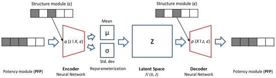 Architecture of the conditional variational autoencoder. The encoder network transforms the potency module (PFP), conditioned by the structure module (c), into a distribution of latent variables (z). The decoder samples a conditioned latent vector from a Gaussian distribution and reconstructs the potency module.