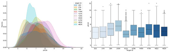 For 10 randomly selected compound activity classes, different ML models were generated. Figure 5 shows that the compound potency value distributions of the activity classes were overlapping yet distinct, mostly yielding median potency values in the high nanomolar range. The comparison also shows that logarithmic potency values below 5 (approaching experimental accuracy limitations) and above 10 (sub-nanomolar potency) were generally sparse.