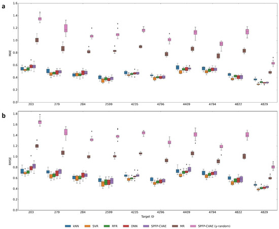 Activity class-dependent potency prediction models were then generated for SPFP–CVAE, k-nearest neighbor (kNN) analysis, SVR, RFR, and DNN. These ML approaches currently represent the state of the art in compound potency prediction [31]. In addition, a mean regressor (MR) was applied as a control, which simply assigned the mean potency value of an activity class to all test compounds. The results are reported in Figure 6.