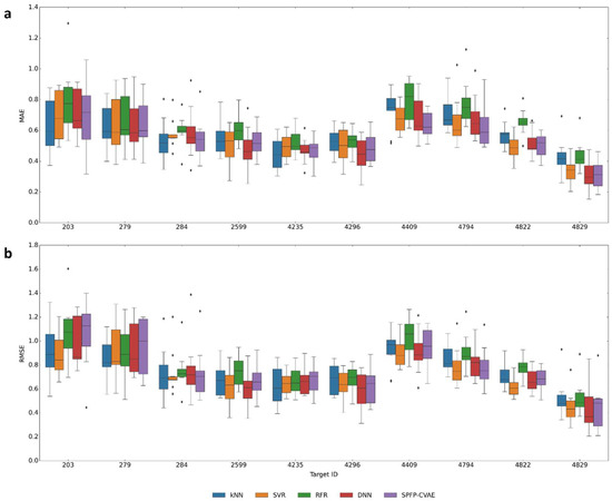 Prediction accuracy. Boxplots report the (a) MAE and (b) RMSE values for potency predictions using different ML models across all activity classes.