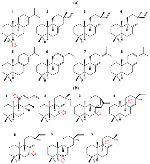 First examples of CYP promiscuity reported in the diterpenoid metabolism: (a) Diterpenoid substrates of CYP720B4 of sitka spruce. All compounds are attacked on C18 whether as methyl, alcohol, aldehyde substituent: 1: abietadiene; 2: isopimaradiene; 3: sandaracopimaradiene; 4: pimaradiene; 5: palustradiene; 6: levopimaradiene; 7: neoabietadiene; 8: dehydroabietadiene. (b) Diterpenes susbstrates of CYP76M8 of rice. Position of oxidative attack on each compound is numbered and indicated by the red arrow. Via these reactions CYP76M8 contributes to the phytocassane, oryzalexin and momilactone pathways: 1: ent-cassa-12,15-diene; 2: ent-pimara-8(14),15-diene; 3: ent-(iso)kaurene; 4: pimara-8(14),15-diene; 5: ent-sandaracopimaradiene; 6: syn-pimara-7,15-diene; 7: sandaracopimaradiene.