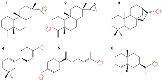 Substrates of the CYP71Z16/18/19 enzymes contributing to four terpenoid defense pathways in maize. The red arrows indicate the sites of oxidative attack: 1: dolabriene and 2: epoxydolabriene (precursors of dolabralexins); 3: ent-kaurene or ent-isokaurene (precursors of kauralexins); 4: β-macrocarpene and 5: β-bisabolene (precusors of zealexins); 6: β-selinene (precursor of costics acids). CYP71Z16 and CYP71Z18 were shown to oxidize 1, 2, 3, 4 and 5. CYP71Z19 was shown to convert 4, 5 and 6. β-bisabolene undergoes triple oxidation at the C1 or C15 positions.