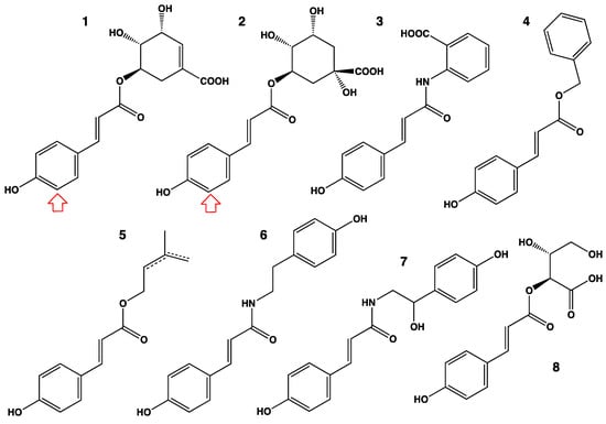 - Chen, H.; Jiang, H.; Morgan, J.A. Non-natural cinnamic acid derivatives as substrates of cinnamate 4-hydroxylase. Phytochemistry 2007, 68, 306–311. [Google Scholar] [CrossRef] [PubMed]