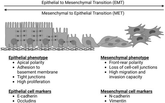 The epithelial to mesenchymal transition (EMT) and the reverse process of the mesenchymal to epithelial transition (MET). EMT is characterized by a loss of epithelial cell markers, an increase in mesenchymal cell markers, a loss of apical cell polarity, a loss of tight cell junctions, and an increased capacity for cell migration and invasion. MET is characterized by a loss of mesenchymal cell markers, an increase in epithelial cell markers, increased apical cell polarity, tight junctions, adherence to a basement membrane, and increased cell proliferation.
