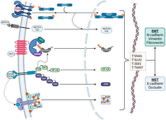 Signaling pathways in EMT. EMT regulation is complex and affected by multiple pathways, which also interact with each other. Regulation is typically via the Transforming Growth Factor β (TGFβ)/SMAD, Notch, canonical wnt, phosphoinositide 3-kinase (PI3K)/Akt, RAS/RAF, and JAK/STAT pathways. The transcription factors that mediate EMT are primarily Snail, Slug, ZEB1, and TWIST. EMT is characterized by an increased production of N-cadherin, vimentin, and fibronectin, and MET is characterized by an increased production of E-cadherin and Occludin.
