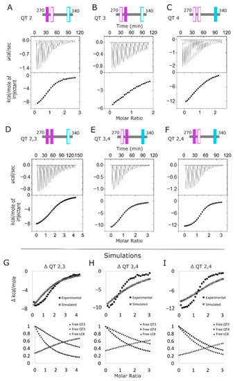 LC8-ASCIZ interactions monitored by ITC. (A–F) Representative thermograms of the titration of LC8 into QT2–4 variants corresponding to the single-site constructs QT2 (A), QT3 (B), and QT4 (C), and the double site constructs QT2,3 (D), QT3,4 (E), and QT2,4 (F). (G–I) Simulated isotherms overlaid on experimental isotherms for each of the double-site variants: QT2,3 (G), QT3,4 (H), and QT2,4 (I). Isotherms were simulated using ΔH and Kd values obtained from single-site isotherms. Fractions of free sites at each point in the simulated isotherms are shown below each, respectively.