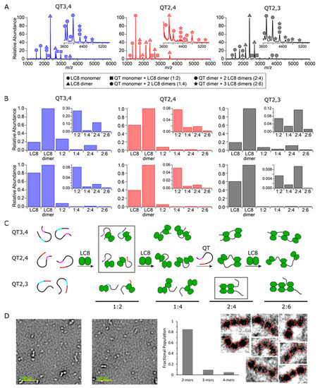Using native electrospray ionization (ESI)-MS, measurements of individual protein mixtures with LC8 allow for the characterization of complex stoichiometries. Similar experiments were used previously to study the complex formation of QT2–4 with LC8 [29]. Accurate mass determination for each protein matches closely with the expected masses of each sequence (Figure S2, Table S2). Upon conducting dilution series, QT3,4, QT2,4, and QT2,3 each remain as monomeric chains while LC8 is overwhelmingly dimeric in solution.