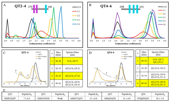 AUC, SEC-MALS, and peptide Kd comparisons for the constructs QT2–4 and QT4–6. AUC titration of (A) QT2–4 (replotted data from Reardon et al. [29]) and (B) QT4–6. SEC-MALS chromatogram and mass key for ranges numbered as shown on the chromatogram for (C) QT2–4 and (D) QT4–6 as single proteins and in complex with LC8. LC8 alone trace is shown plotted with both proteins for reference. Highlighted regions of the mass key emphasize the major peaks seen in the SEC-MALS traces of the mixture. (E) Measured Kd values for peptides representing the five binding sites [10] represented across the two analyzed constructs.