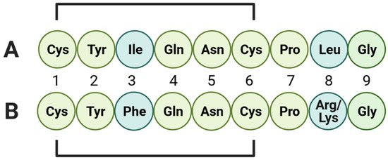 The structure and amino acids sequence of (A) OT and (B) AVP. The lines indicate cysteine residues that form a sulfur bridge by disulfide bonds. OT and AVP structures differ in the first and eighth place in the aminoacid sequence (dark green). This figure was created with https://biorender.com/ (accessed on 10 January 2023).