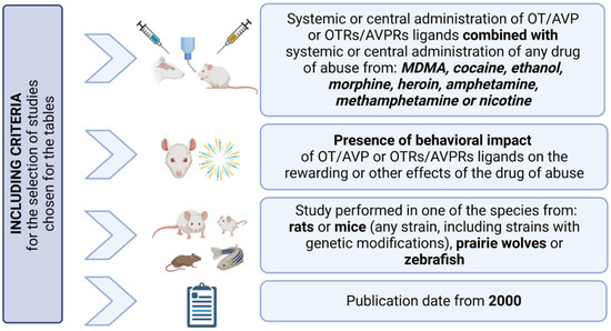 Extensive studies in animal models have proven the involvement of OT and AVP neurotransmission in behavioral and rewarding effects of different drugs of abuse. Specifically, the effects of OT, OTRs ligands, AVP and AVPRs ligands have been summarized in this review. The selection of studies included in these tables has been based on the following criteria: (1) systemic or central administration of OT/AVP or OTRs/AVPRs ligands combined with the systemic or central administration of any drug of abuse from MDMA, cocaine, ethanol, morphine, heroin, amphetamine, METH or nicotine; (2) presence of the behavioral impact of OT/AVP or OTRs/AVPRs ligands on the rewarding or other effects of the drug of abuse; (3) study performed in one of the species from rats or mice (any strain, including strains with genetic modifications), prairie wolves or zebrafish; (4) publication dates from 2000 (Figure 2). The choice of the animal species included in this review has been based on (a) their sociability and willingness to live in groups and (b) the presence of data on the chosen drugs of abuse and correlated addictive-like behaviors in those species. The abundance of presented data certainly proves the involvement of OT/AVP in the modulation of different effects of drugs of abuse; nevertheless, to comprehensively summarize collected data, several aspects require underlining, clarification and comment.