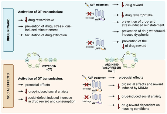 Recently, there has been a growing interest in OT and AVP systems as potential therapeutic targets for the treatment of drug abuse. Therefore, the aim of this review is to comprehensively characterize the involvement of OT and AVP in the rewarding and other behavioral effects of drugs of abuse in animal models, with a special highlight on the impact of social factors on the observed effects. Specifically, the relationship between OT and AVP neurotransmission and the behavioral/rewarding effects of 3,4-methylenedioxymethamphetamine (MDMA), cocaine, ethanol, amphetamine, methamphetamine (METH), morphine, heroin and nicotine was reviewed in this paper. Because several clinical trials on OT use in drug addiction have already been conducted (see Section 6), a thoughtful insight into ligands acting via receptors for OT and AVP may result in identifying novel therapeutic targets for the treatment of substance use disorder.