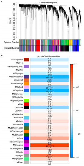Construction of co-expression network and identification of hub modules. (A) Cluster dendrogram. Each branch indicates one gene, and each color represents one co-expression module. (B) Heatmap–module–trait relationships. The number in each module indicates the correlation coefficient and the corresponding p-value.