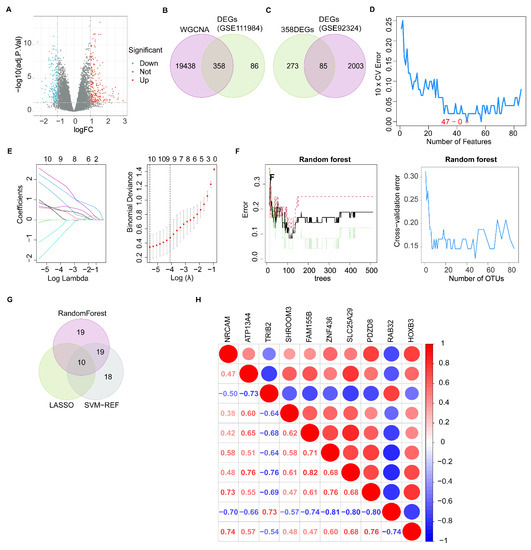 A total of 444 DEGs, including 253 upregulated and 191 downregulated genes, were obtained from the GSE111974 dataset (Figure 2A). A total of 19,796 module genes were identified from ten candidate hub modules in WGCNA. Next, 358 genes were screened, based on the intersection of DEGs (GSE111974) and 19,796 module genes (Figure 2B). Subsequently, 358 genes were further intersected with DEGs (GSE92324) to accomplish preliminary screening of the 85 intersecting genes (Figure 2C). Based on the 85 DEGs, the SVM-RFE (Figure 2D), LASSO (Figure 2E), and RF (Figure 2F) evaluations identified 47, 10, and 48 genes, respectively. Ten overlapping genes were screened as hub genes (Figure 2G). Correlations between the ten hub genes were significant (p < 0.01). TRIB2 and RAB32 were negatively correlated with NRCAM, ATP13A4, SHROOM3, FAM155B, ZNF436, SLC25A29, PDZD8, and HOXB3 (Figure 2H). RAB32 had the highest negative correlation with ZNF436 (cor = −0.81), SLC25A29 (cor = −0.80), and PDZD8 (cor = −0.80). FAM155B had the highest positive correlation with SLC25A29 (cor = 0.82).