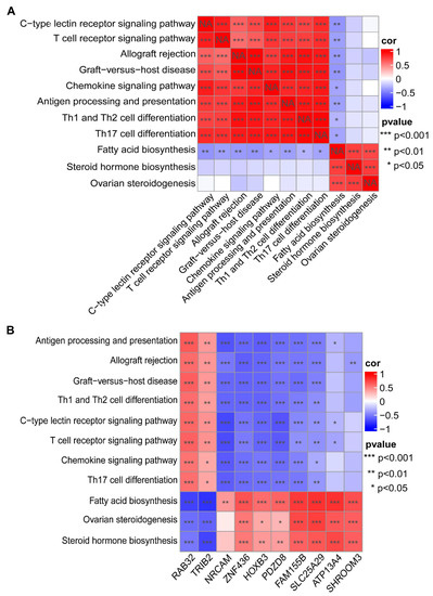 Correlation analysis of signaling pathways and hub genes. (A) Heatmap of the correlation between lipid metabolism and immune pathways. (B) Heatmap of the correlation between signaling pathways and the ten hub genes.