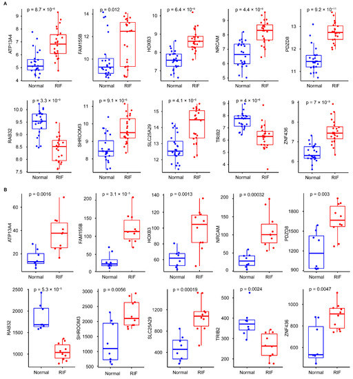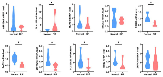 To further validate the important role of ten hub genes in RIF, we collected the endometrial tissues from the RIF and control women. RT-qPCR results (Figure 9) showed that RAB32 and TRIB2 expression levels were significantly lower in the RIF patients than in the controls, while the expression levels of FAM155B was significantly higher, consistently in both datasets. However, PDZD8, SHROOM3, and SLC25A29 showed opposite results; their expression levels were significantly decreased in the RIF patients. The expression of another four hub genes (ATP13A4, HOXB3, NRCAM, and ZNF436) was not significantly different between the two groups. Hub genes were expressed in the endometrium. Detecting endometrial hub genes as biomarkers to predict RIF may be feasible in assisted reproductive technology.