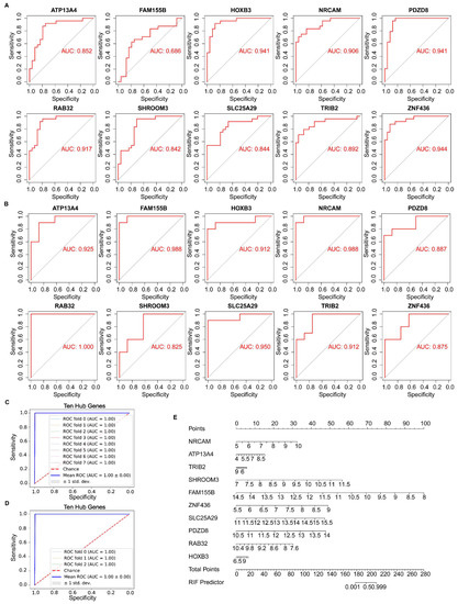 Hub gene expression levels were identified using box plots. In both the GSE111974 (Figure 5A) and GSE92324 datasets (Figure 5B), NRCAM, ATP13A4, SHROOM3, FAM155B, ZNF436, SLC25A29, PDZD8, and HOXB3 had significantly higher expression levels in RIF than in healthy controls (p < 0.05), while TRIB2 and RAB32 expression levels were significantly reduced in RIF (p < 0.05). ROC analysis was executed to calculate the area under the curve (AUC) values to compare the sensitivity and specificity of hub genes in diagnosing RIF. The AUC value of every hub gene was greater than 0.600 in both datasets (Figure 6A,B). The combined diagnostic AUC value of the ten hub genes was 1.000 in both datasets (Figure 6C,D). Using the diagnostic nomogram, a combined diagnostic model of ten hub genes was constructed from the GSE111974 dataset (Figure 6E).