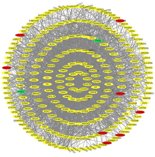 The betweenness centrality gradually increased from the outer circle to the inner circle. Two downregulated (TRIB2 and RAB32) and eight upregulated (NRCAM, ATP13A4, SHROOM3, FAM155B, ZNF436, SLC25A29, PDZD8, and HOXB3) hub genes were shown in green and red, respectively. The 238 ERA genes were shown in yellow. In the PPI network, ten hub genes as the potential RIF biomarkers interacted with the ERA genes (Figure 7). In the correlation analysis, ten hub genes, specifically RAB32, FAM155B, and SLC25A29, showed significant correlation with most ERA genes (p < 0.05), including NR4A2, SLC16A6, MAP2K6, CAPN6, DUOX1, RANBP17, BIRC3, COTL1, STEAP4, and PROM1 in the GSE111974 (Supplementary Figure S3) and GSE92324 (Supplementary Figure S4) datasets. The 10 ERA genes belonged to the intersection (Supplementary Figure S5) of the 85 DEGs (Supplementary Table S5) and 238 ERA genes (Supplementary Table S6) and were enriched in the biological process network (Figure 3B) and NF-κB and TNF signaling pathways (Figure 3D). The expression trend of 10 ERA genes in RIF in both datasets was exactly the opposite of that in ERA (Supplementary Table S7). Considering the guiding significance of ERA, to a certain extent, this indicates that endometrial receptivity may be impaired in RIF. Given the interactions and correlations between hub genes and ERA, the impaired endometrial receptivity may be linked to hub genes. Hence, the ten hub genes may have a certain clinical diagnostic value and serve as complementary genes for ERA.