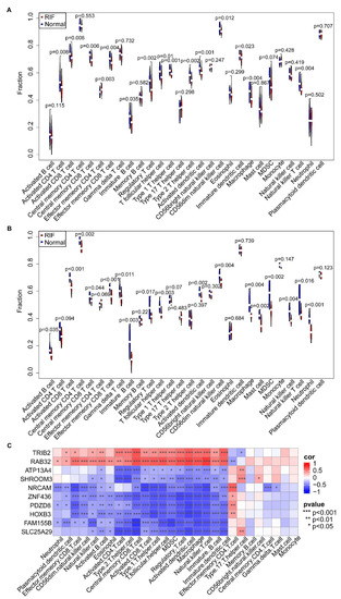 Given the potential roles played by immune signals in RIF, the differences in immune cell infiltration between RIF and healthy controls were evaluated using ssGSEA in the GSE111974 dataset (Figure 8A). In Natural killer T, macrophage, immature dendritic, CD56dim natural killer, activated dendritic, Th2, Th1, T follicular helper, regulatory T, immature B, effector memory CD8 T, central memory CD8 T, activated CD8 T, and activated CD4 T cells, a total of 14 immune cells showed significantly lower infiltration in the RIF group than in the controls (p < 0.05). Notably, the ratio of Th1 to Th2 cells did not change significantly between the RIF group and the healthy controls (1.089 vs. 1.073, p = 0.439). The ratio of Th17 to Tregs increased significantly between the RIF group and healthy controls (0.702 vs. 0.600, p = 0.007). In the GSE92324 dataset, 17 immune cells showed significantly reduced infiltration in RIF (p < 0.05) (Figure 8B). Significant correlations were observed among the 28 immune cells (p < 0.05) (Supplementary Figure S6). Ten hub genes were significantly correlated with immune cells (p < 0.05) (Figure 8C).
